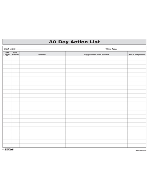 The 30 Day Action List describes the activities, assigns the person responsible for completion, and provides possible solutions. Using this form assists in continuance of a sustainable lean program.