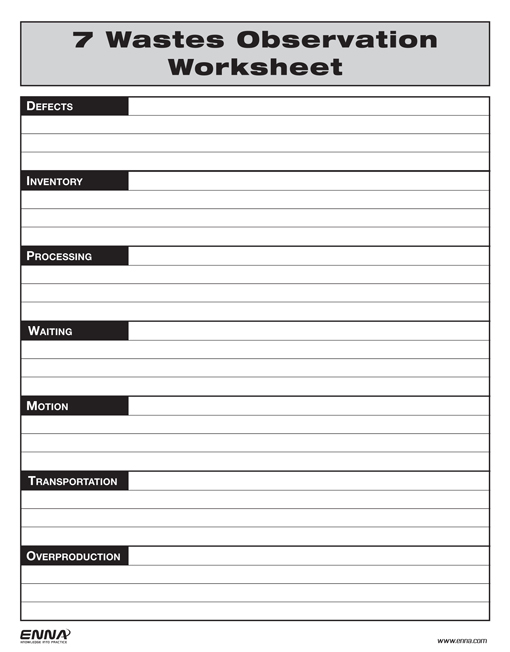 This form is a template of the 7 Wastes and is used as a tool in presenting Lean thinking concepts to participants. The aim is to provide the participants with an analysis tool for assessing the opportunities to eliminate waste in an area or their department.
