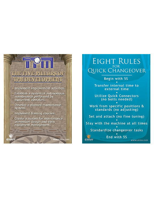 Take the training room to the shop floor with Enna’s new full color mini-poster cards. These vivid adaptations of Enna’s most popular Lean posters are the perfect pocket-sized companion for handing out to managers, supervisors, and shop floor associates. Attractive enough for display yet durable enough to stand up to shop floor environments, these appealing mini-poster cards ensure that key concepts of Quick Changeover and TPM are always within reach.