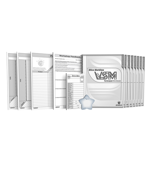This package consists of six pads; one pad of each form including Data Boxes and Kaizen Bursts as well as Workshop Feedback Forms, plus eight participant workbooks. It is provided at a value price to encourage continuous Value Stream Mapping Office Workshops by helping to ensure the highest success rate for you and your company.